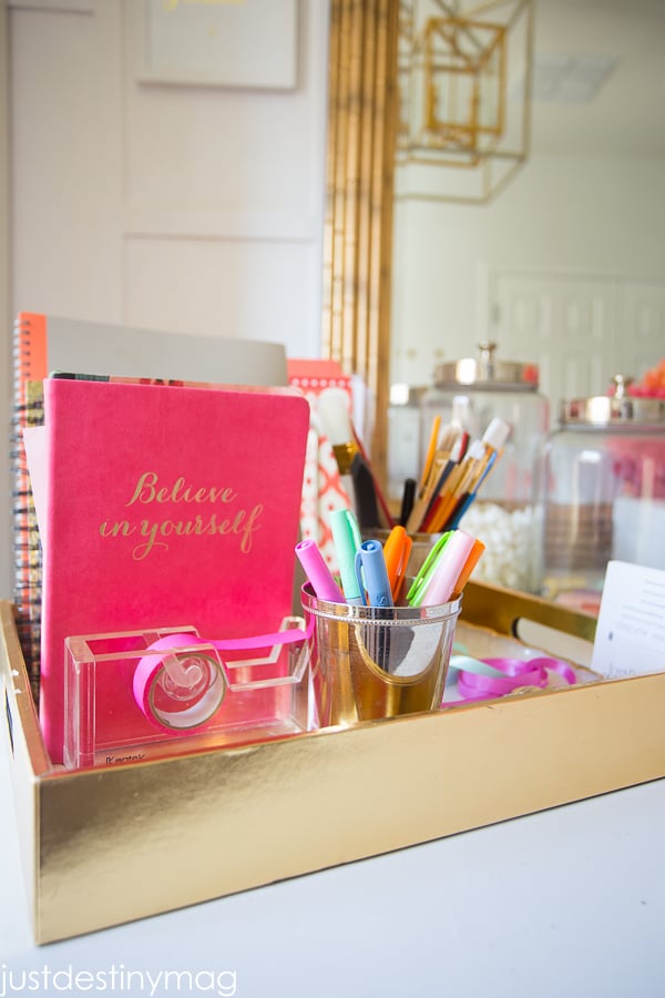 What a beautiful office!!! Where did you find the gold tray and the colored paper hat boxes?