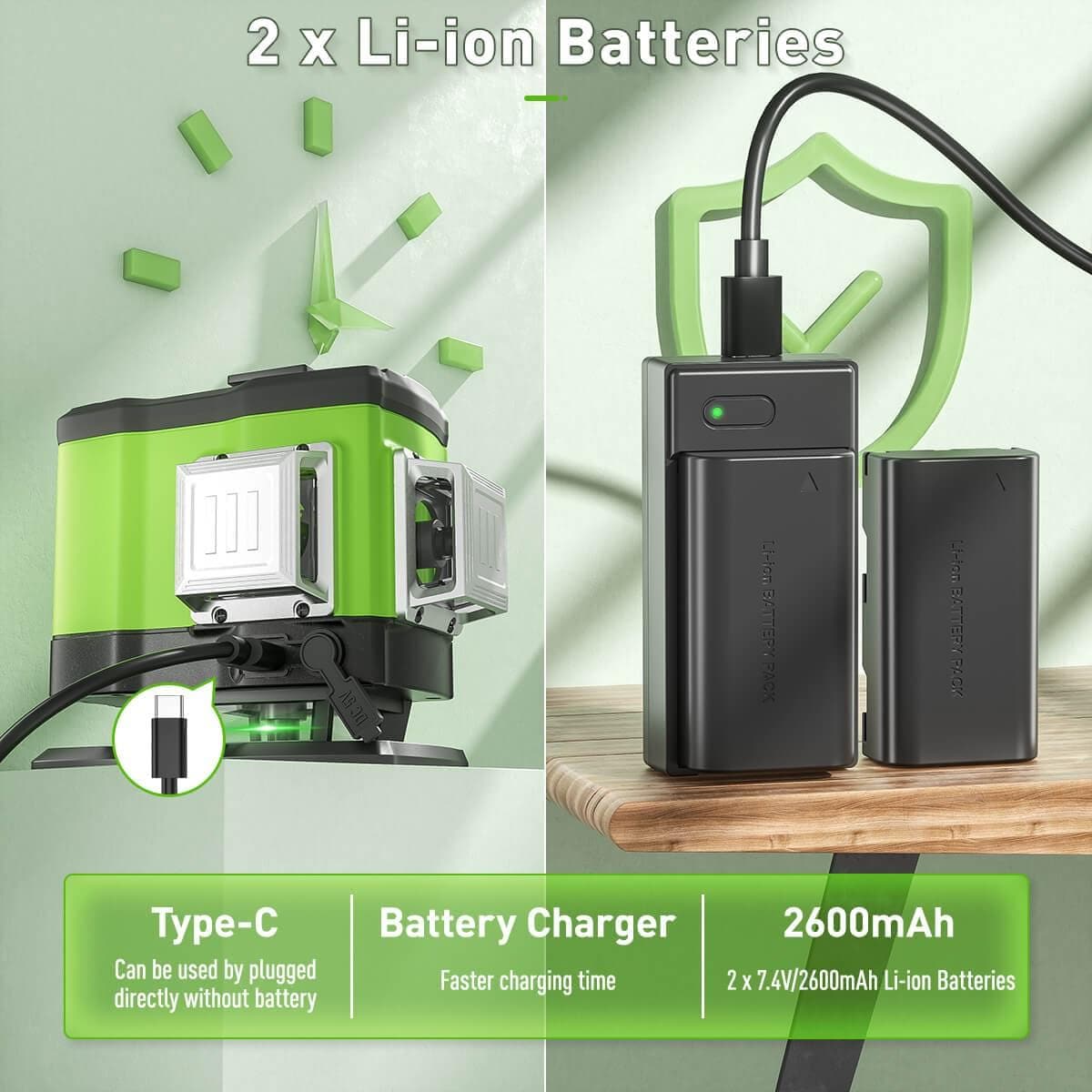 • DUAL POWER METHODS&TYPE-C PORT: Huepar 503DG laser level employed large capacity lithium battery (can be purchased easily at local market) for 6 hours use with all beams on. An extra battery is included for backup. Besides, this construction laser level can be used at job site by plugged in when take out the battery. With Type-C charging port, the laser level can also be charged by phone, laptop, power bank, car charger, etc. Users can charge the battery independently with the battery charger included.