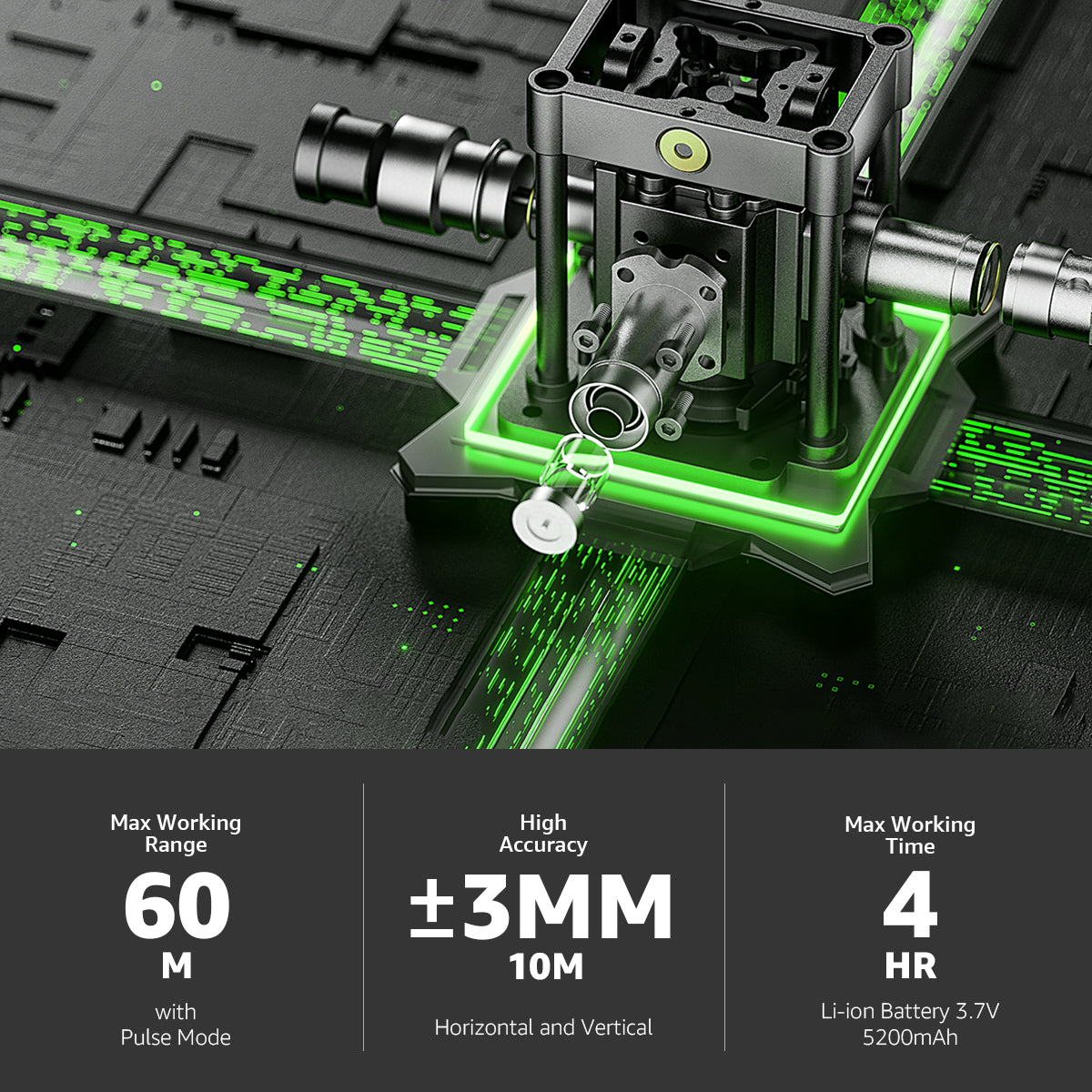 Huepar 904DG Laser Level employed a large capacity of 3.7V / 5200mAh Li-ion Battery and provides up to 6-12 hours of running time. The Li-ion Battery comes with a Type-C charging port that can be charged separately. When taking out the battery, this 4D laser level can be used at the job site by plugged in directly. The 16 lines laser level can also be charged by laptop, power bank, car charger, etc.