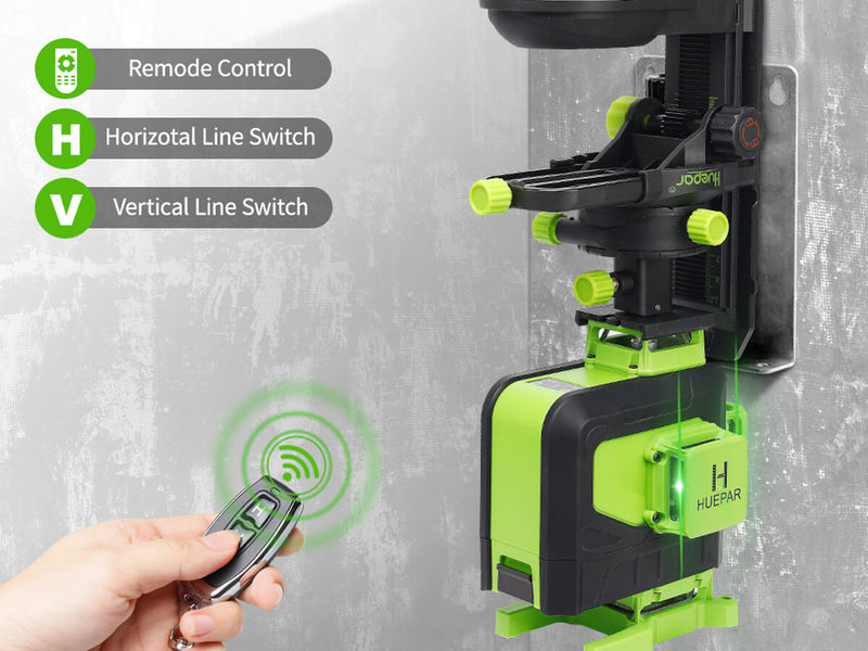 The remote control enables to select three 360° laser lines individually at a distance up to 33Ft.