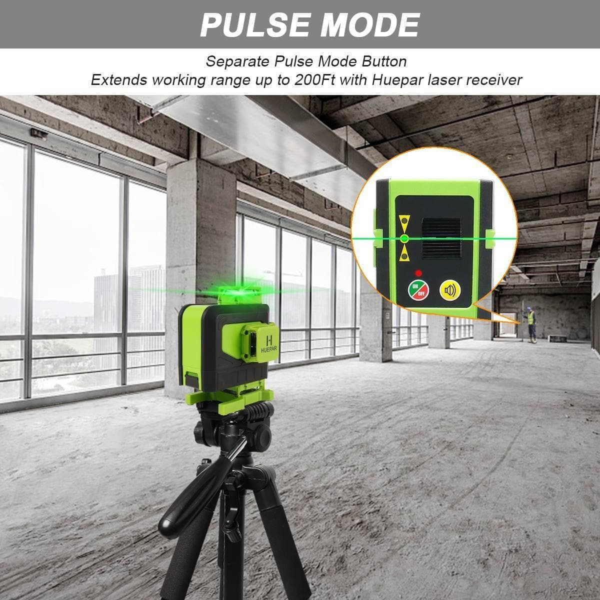 Pulse mode extends the working range up to 165 feet in brighter conditions when used with the Huepar Line Laser Receiver. It is only compatible with the Huepar LR-6RG / LR-5RG Laser Detector. Note: Keep the pulse mode on when using with a receiver.