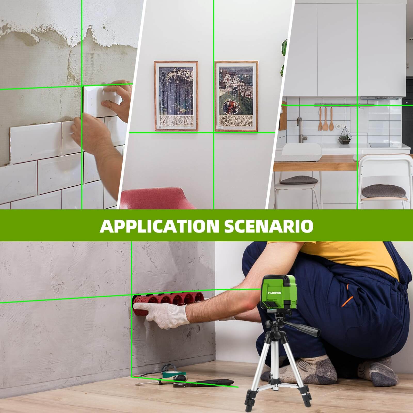 - 【98FT High Precision Cross Line Laser Level】The Huepar laser level adopts Diode Technology, emits bright Osram’s green beam projects a 110° horizontal line and a 110° vertical line when working, providing high visibility up to 100 feet away with an accuracy of ± 1/9 inch at 33 feet(±3mm/10m). This cross-line laser is ideal for paving tiles, installing photos, doors, windows, furniture carpentry, hanging wallpaper, etc. This Laser Level NOT suitable for outdoor.