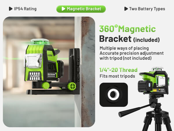 The Huepar HX03CG comes with a 360° Multi-Functional Magnetic Bracket, designed for effortless versatility. Whether you're positioning the device on a wall, column, or using a tripod (not included), this bracket provides flexible mounting solutions, ensuring precise alignment in any scenario.