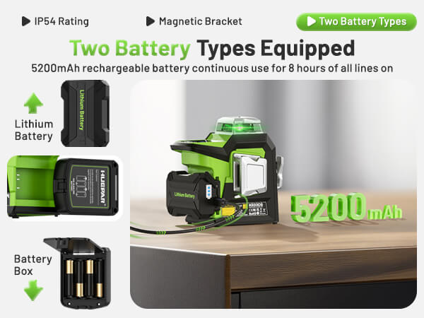 The Huepar HX03CG offers dual battery options, giving you the freedom to choose between a powerful 5200mAh lithium battery or a convenient battery box. Therechargeable 5200mAh lithium batteryallows for continuous use for up to 8 hours with all lines active, ensuring long-lasting performance on demanding projects. Alternatively, thebattery boxoffers flexibility by allowing the use of standard AA batteries, providing a reliable backup when needed. This thoughtful design keeps your work uninterrupted, giving you the power to stay productive, no matter the task at hand.