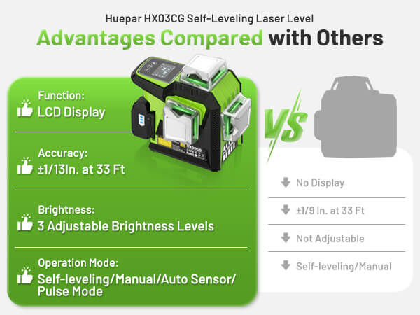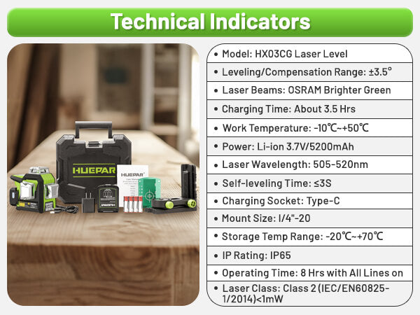 Explore the remarkable capabilities of the Huepar HX03CG, featuring an upgraded green beam laser with brightness far exceeding that of ordinary beams. Whether you're working on a major construction project or a home DIY task, this tool offers a brighter, sharper reference line that ensures precision and efficiency in every job.