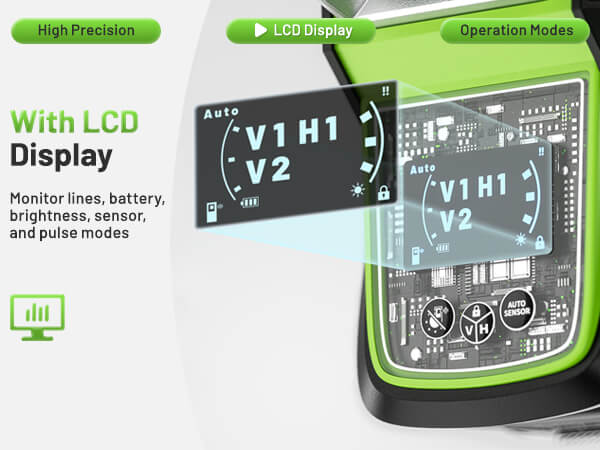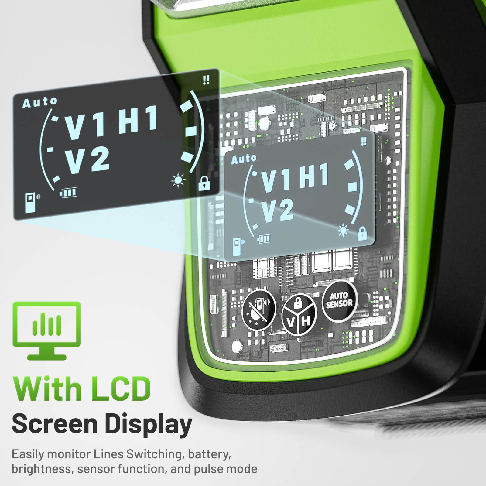 The Huepar HX03CG features a modern LCD display, providing an intuitive monitoring experience that makes the workflow smarter. With the LCD display, you can easily track the laser's working status—real-time monitoring of laser line modes, battery level, brightness adjustments, sensor status, and pulse mode switching. All information at a glance makes the operation more convenient and helps you stay efficient in various working environments, allowing you to achieve precision and efficiency effortlessly.