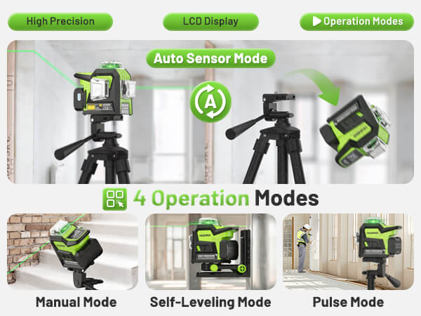 - Auto Sensor Mode: Automatically adjusts laser level, minimizing manual intervention.