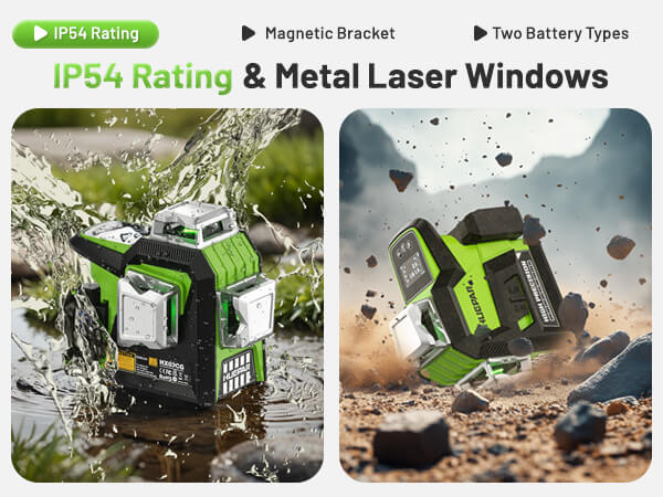 Built to withstand the elements, the Huepar HX03CG offersIP54-ratedprotection against water and dust, ensuring reliability in the toughest conditions. Its robust construction featuresmetal laser windowsfor enhanced durability, providing optimal performance even in rugged environments.