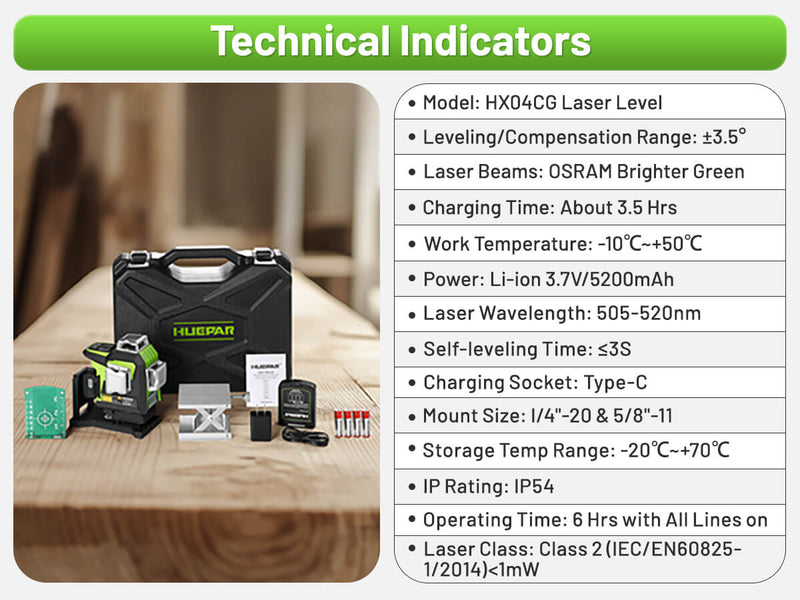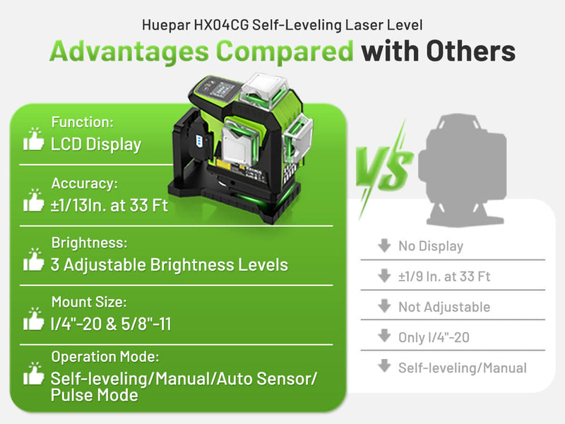 Explore the remarkable capabilities of the Huepar HX04CG, featuring an upgraded green beam laser with brightness far exceeding that of ordinary beams. Whether you're working on a major construction project or a home DIY task, this tool offers a brighter, sharper reference line that ensures precision and efficiency in every job.
