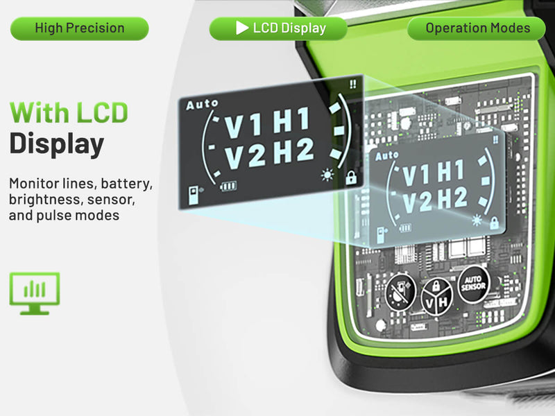 The Huepar HX04CG features a modern LCD display, providing an intuitive monitoring experience that makes the workflow smarter. With the LCD display, you can easily track the laser's working status—real-time monitoring of laser line modes, battery level, brightness adjustments, sensor status, and pulse mode switching. All information at a glance makes the operation more convenient and helps you stay efficient in various working environments, allowing you to achieve precision and efficiency effortlessly.
