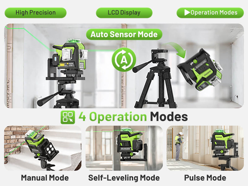 - Auto Sensor Mode: Automatically adjusts laser level, minimizing manual intervention.