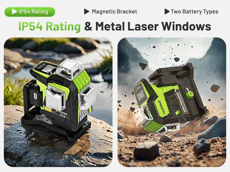 Built to withstand the elements, the Huepar HX04CG offers IP54-rated protection against water and dust, ensuring reliability in the toughest conditions. Its robust construction features metal laser windows for enhanced durability, providing optimal performance even in rugged environments.