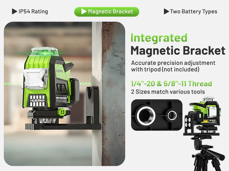 The Huepar HX04CG comes with a 360° Multi-Functional Magnetic Bracket, designed for effortless versatility. Whether you're positioning the device on a wall, column, or using a tripod (not included), this bracket provides flexible mounting solutions, ensuring precise alignment in any scenario.