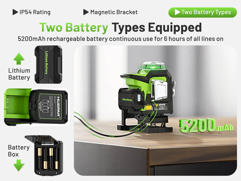 The Huepar HX04CG offers dual battery options, giving you the freedom to choose between a powerful 5200mAh lithium battery or a convenient battery box. Therechargeable 5200mAh lithium batteryallows for continuous use for up to 6 hours with all lines active, ensuring long-lasting performance on demanding projects. Alternatively, thebattery boxoffers flexibility by allowing the use of standard AA batteries, providing a reliable backup when needed. This thoughtful design keeps your work uninterrupted, giving you the power to stay productive, no matter the task at hand.