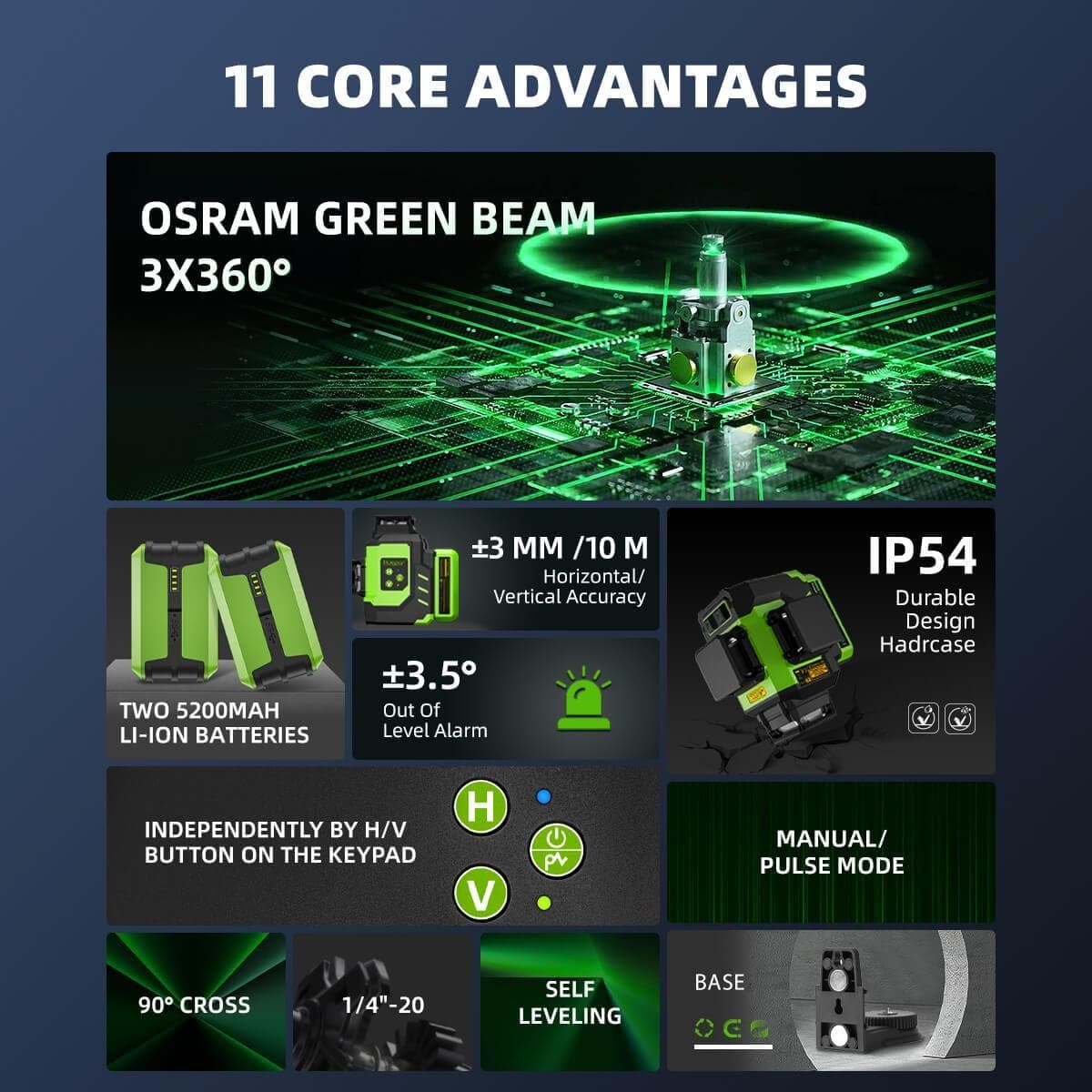 - Projection: 3 x 360° Green Laser Lines