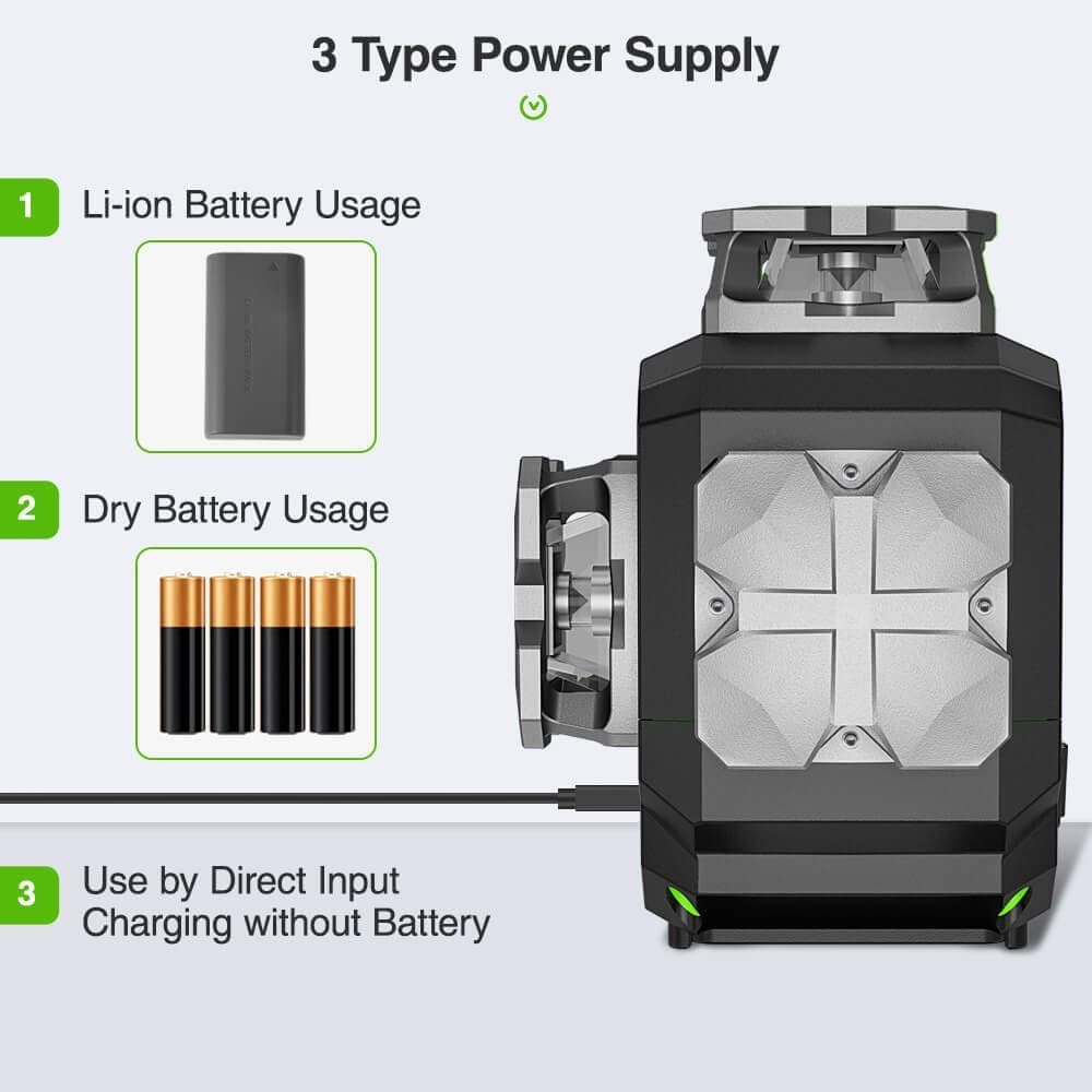 TRIPLE POWER METHODS&TYPE-C PORT: This 360 laser tool adopted large capacity Li-ion battery (can be purchased easily at local market) for extended run-time, or with 4 AA alkaline batteries. The Li-ion battery has a Type-C charging port to be charged separately and can also be charged by phone, laptop, power bank, car charger, etc. The included battery holder is for installing 4 AA batteries to use the tool. The laser tool can be used at job site by plugged in when taking out the battery.