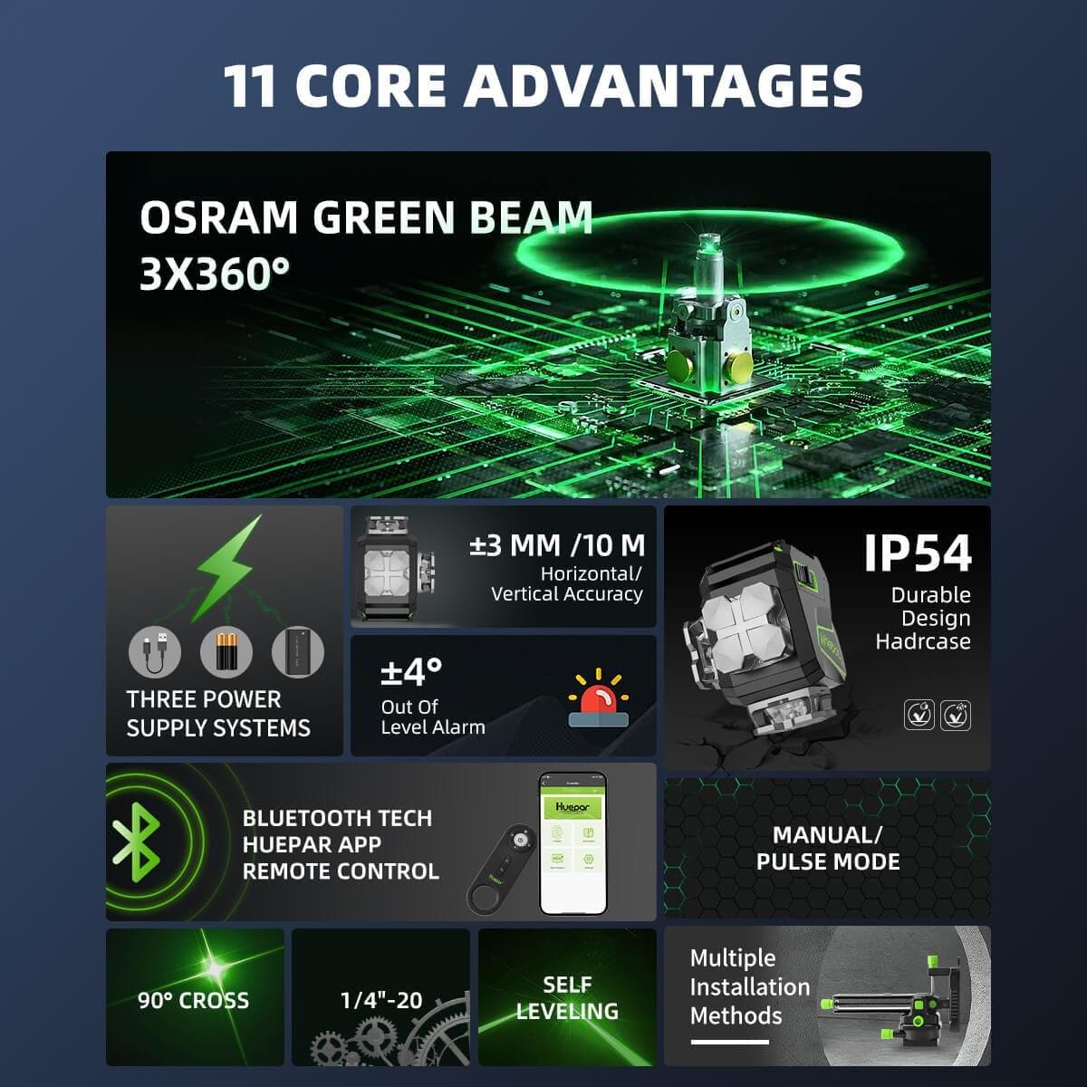 - The Bluetooth remote control / Huepar APP enables to select three 360° laser lines individually at a distance up to 98Ft.