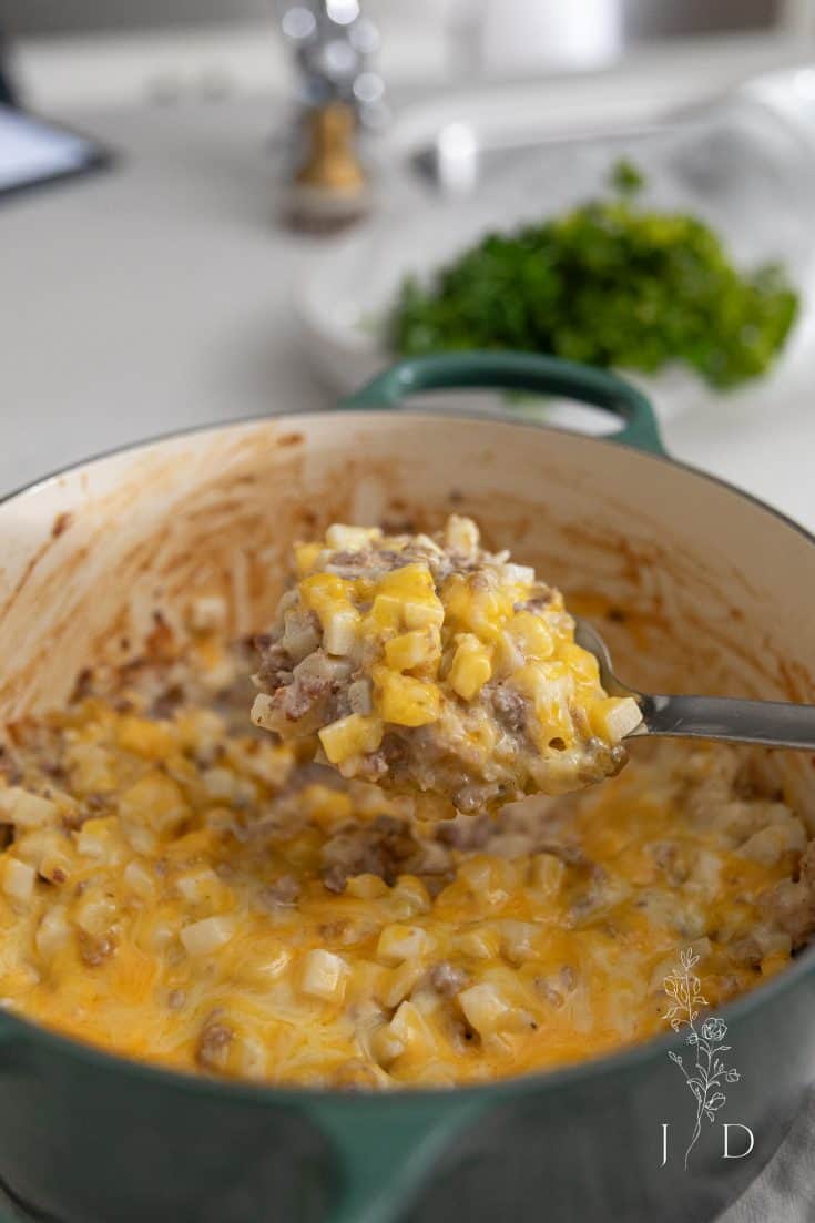Leave or drain any excess fat from the sausage. Add the frozen diced hash browns to the pot with the sausage. Stir in the cream of mushroom soup and whole milk, mixing until everything is well combined. This makes for a creamy base for the potatoes and sausage and will thicken while it cooks! You can also use cream of chicken if you don’t have cream of mushroom.
