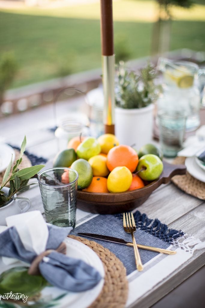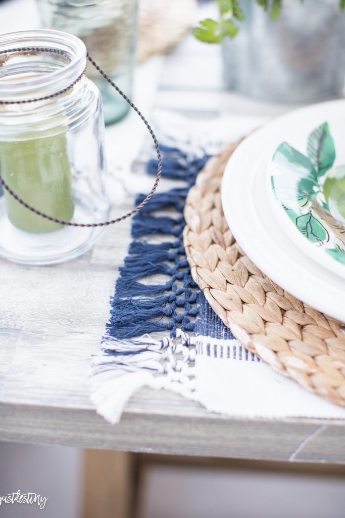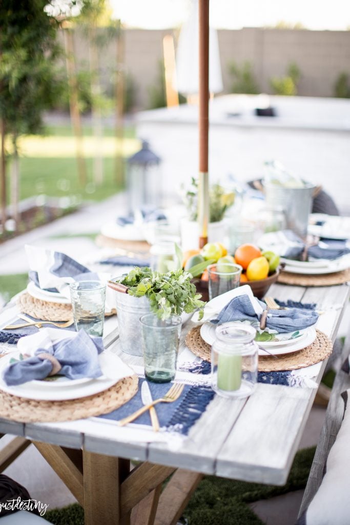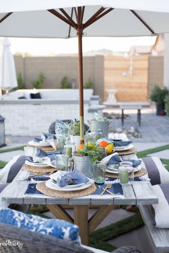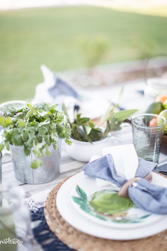 Theme: Whether it’s by color or by event, picking a theme is important when deciding how you will set your outdoor table! I went for a casual setting in a classic blue with pops of green using the new outdoor dining, Jungle Fruit Collection . The coastal vibe mixed with just a little bit of tropical make this space come together.