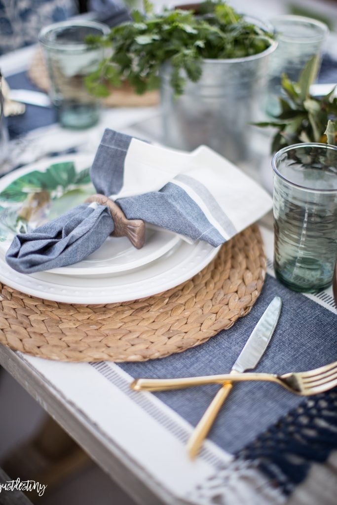 Layering textiles is key to creating a perfect outdoor table. You can see I used both a placemat AND charger! Rule breaker, but I love the look! Next to the goldware, I think it keeps this space fun.