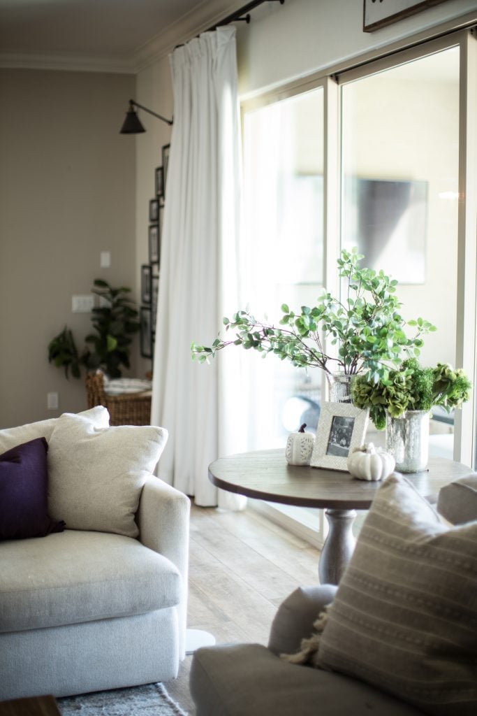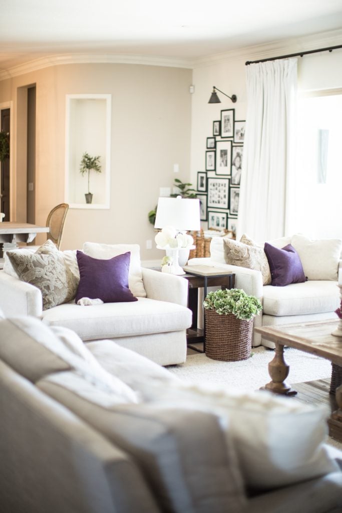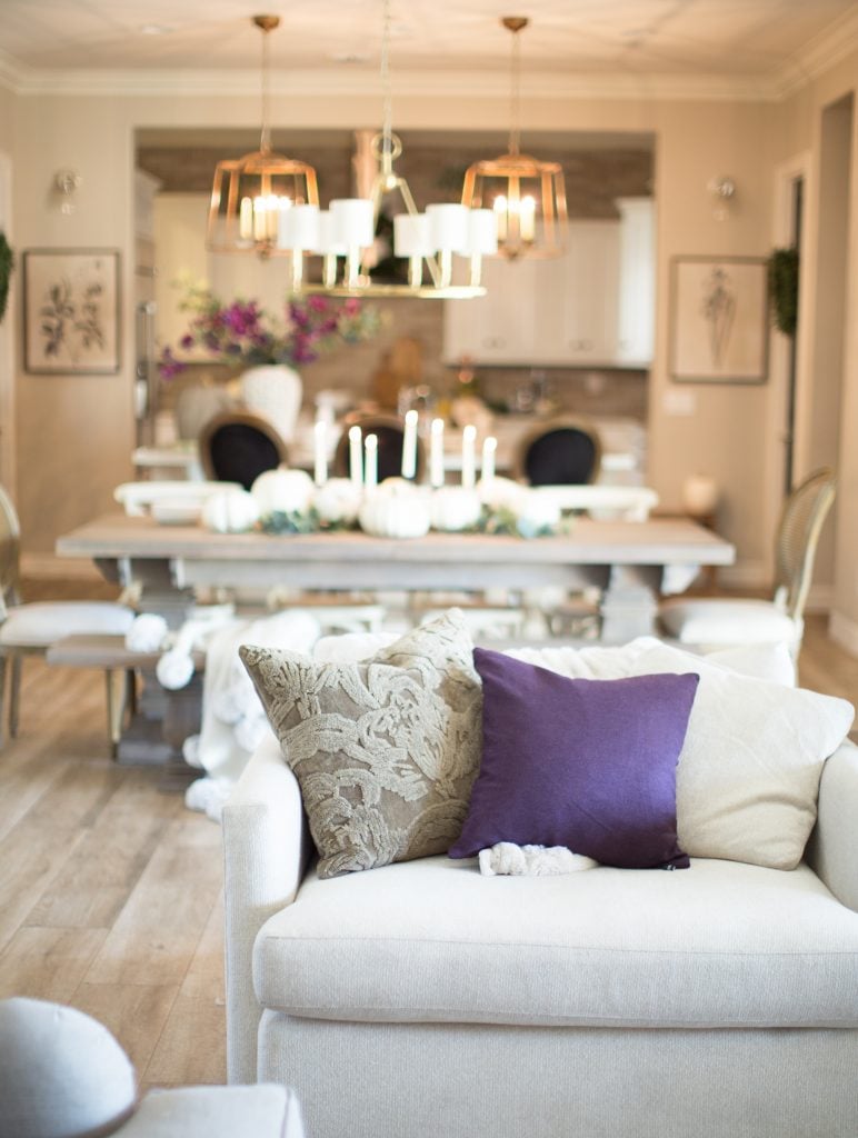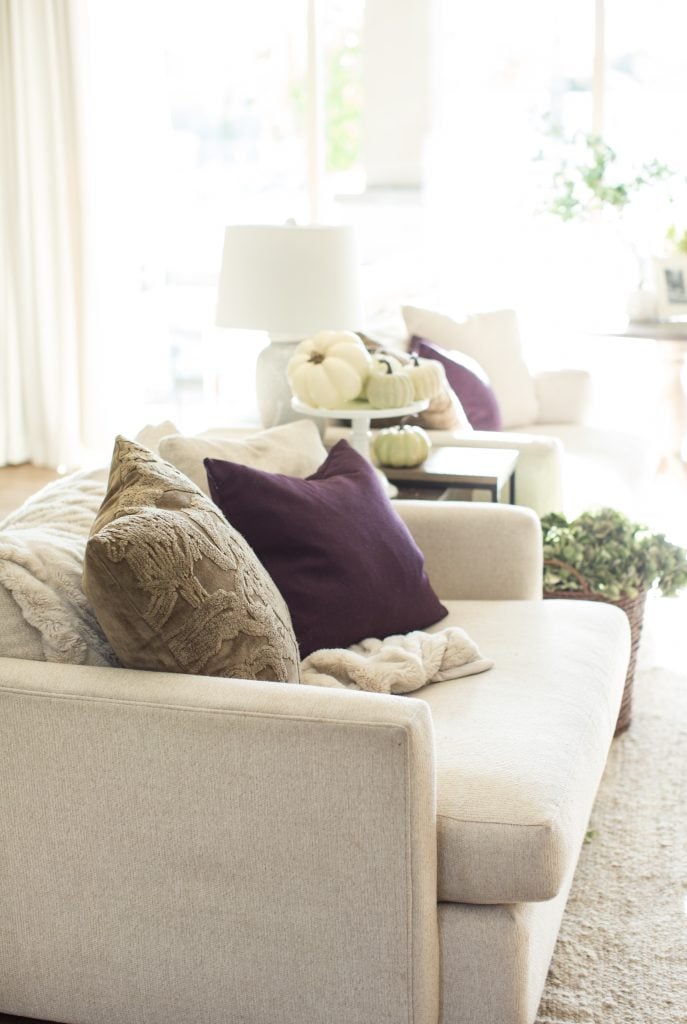 Traditional colors like burnt orange, mustards and burgundies are SO charming and down right cozy. When I close my eyes and think “fall” those are the colors I see, probably because those are the colors nature gives us during that season! But there are so many different colors to decorate with and a lot of times it may just not be natural for you to bring traditional fall colors into your home! So on this tour you will see just a touch of plum throughout each room hugged by a bunch of neutrals! I’ve never used this color before but just like any color I use in my home I just add it here and there for bold accents and pops around the room! If you were just to come in and scan my home with your eyes, I would want to you see the color out of the corner of your eye and connect with it again as you keep scanning the room. Does that make sense? ha! I hope so!