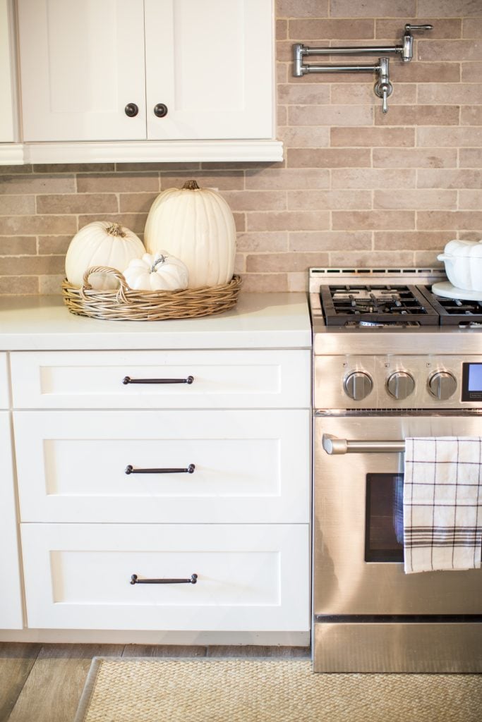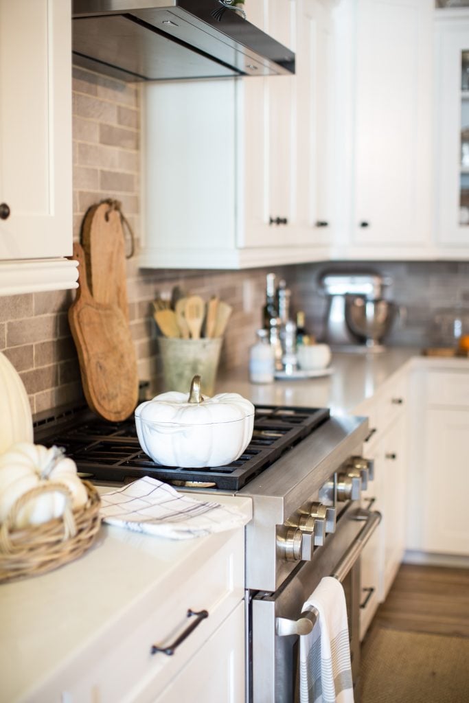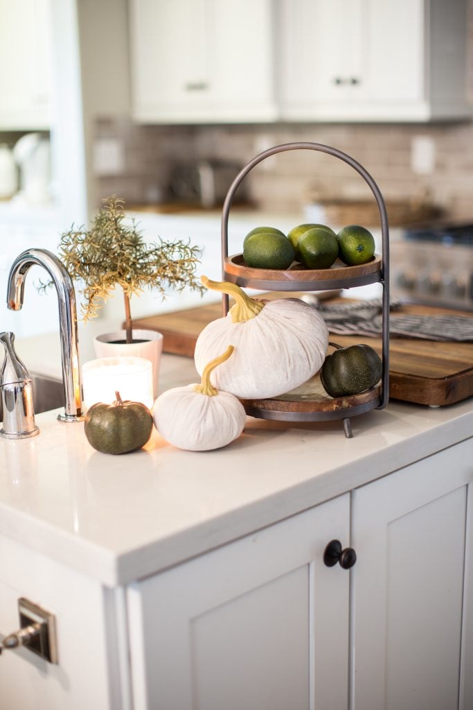Further into the kitchen I sprinkled a few pumpkins here and there. I didn’t repeat the plum color in here only because I thought that HUGE ginger jar with those plum colored florals did a great job at making a BIG statement!