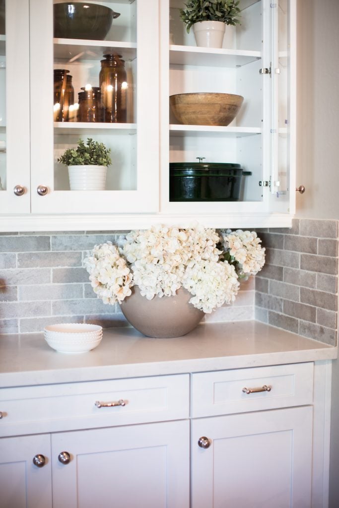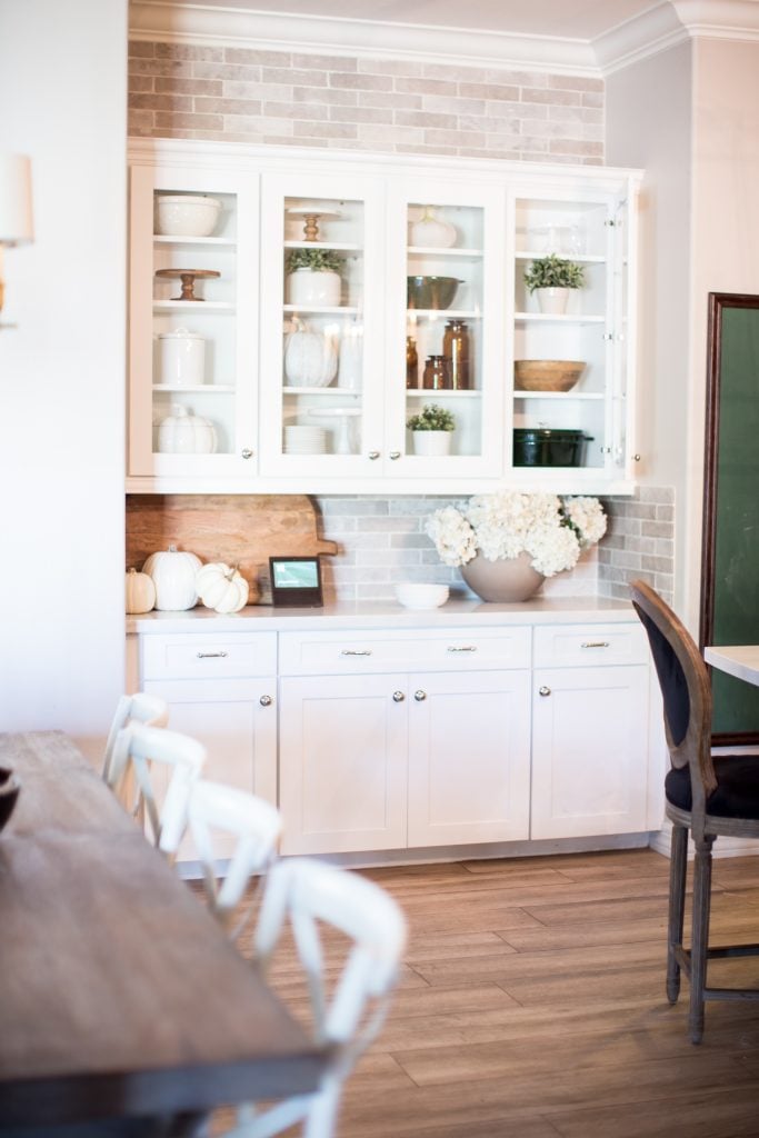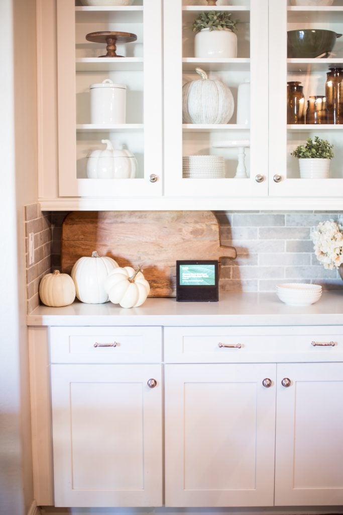 Over in my hutch area I kept it neutral and added a collection gorgeous amber colored jars ( OMG I WANT EVERYTHING IN THIS COLOR NOW) and coupled it with some dark green STAUB cookware that I had. If you collect a certain color of cookware like me this is the perfect place to display those beauties and even a great jumping off point for your fall decor color!