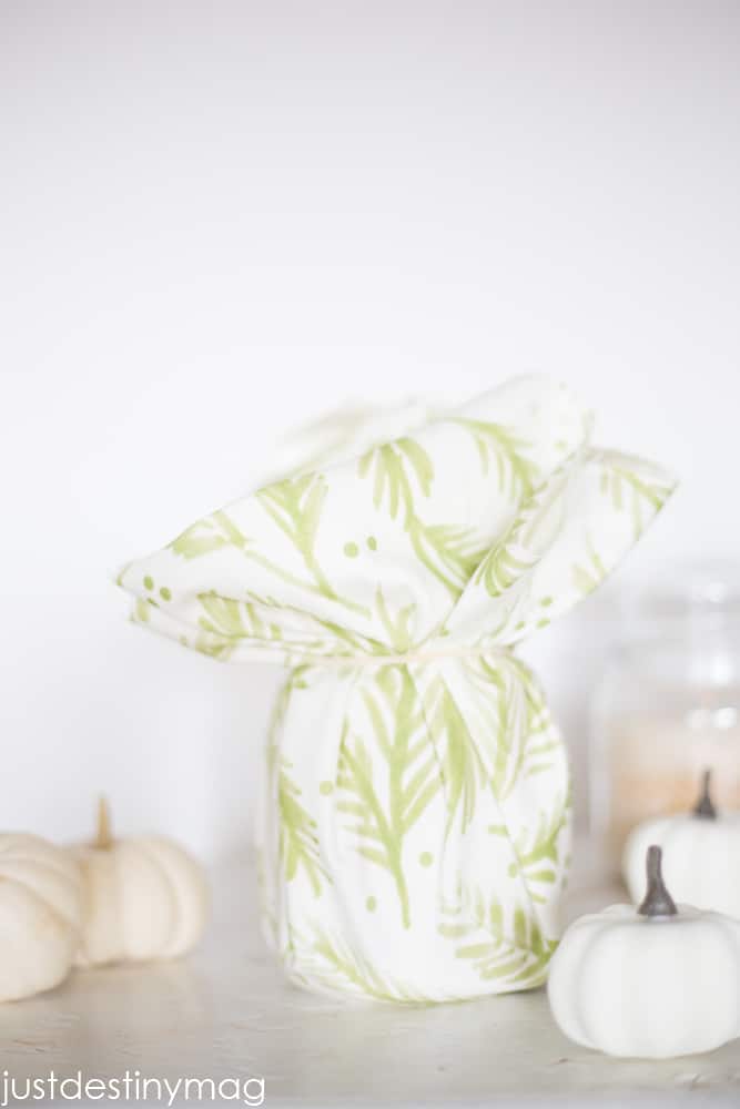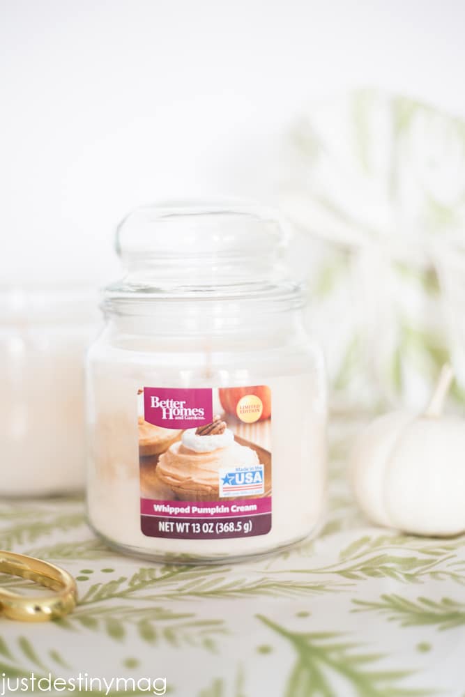 For this project I picked a few candles from Walmart’s BHG line! These candles are perfect and the scents are a real treat for anyone who receives them plus they are affordable! Walmart also has fabric and although my local Walmart stopped selling it for years they recently brought it back. So just pick out your favorite fabric and ribbon from the craft section and you’re all set!