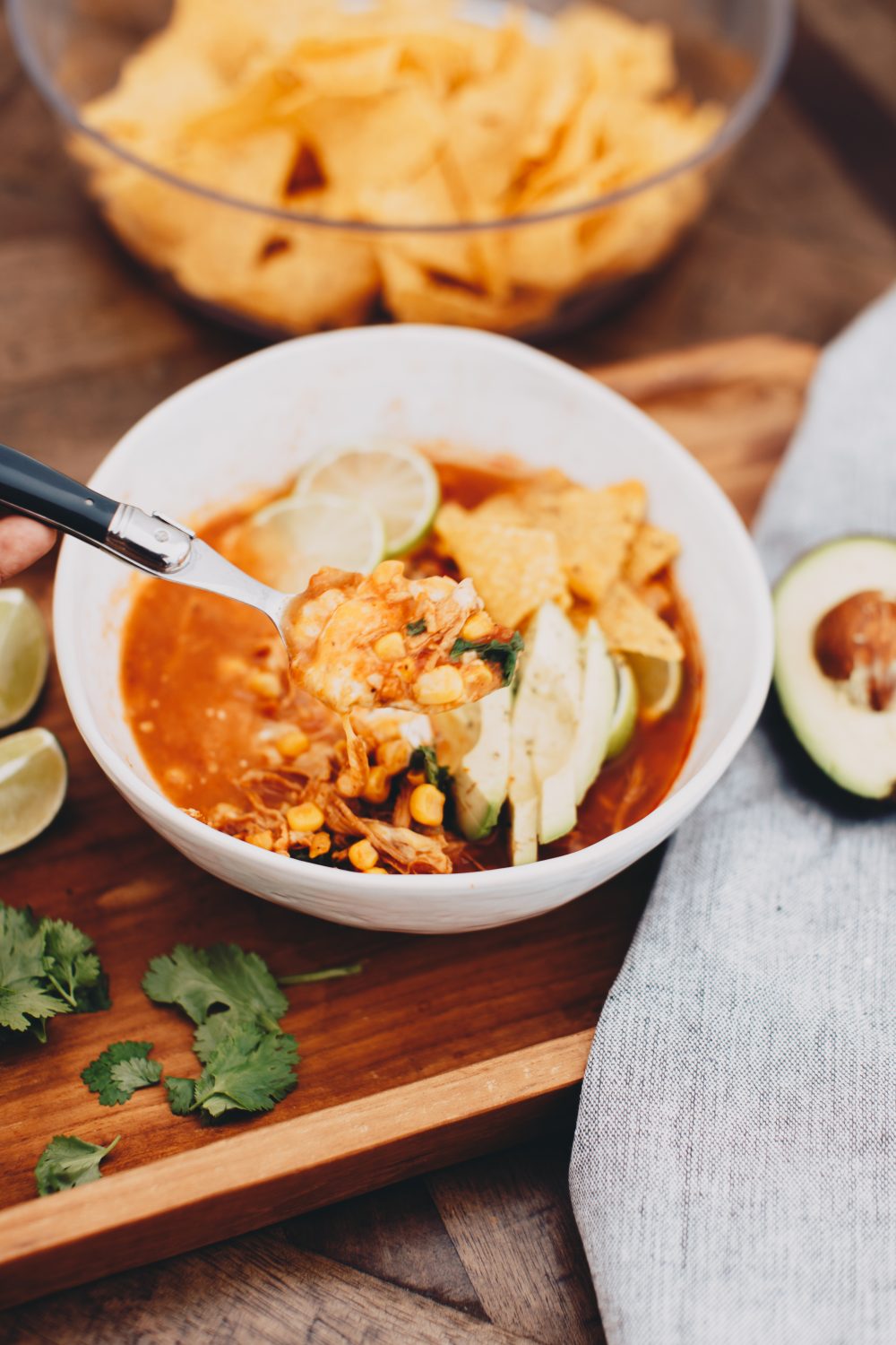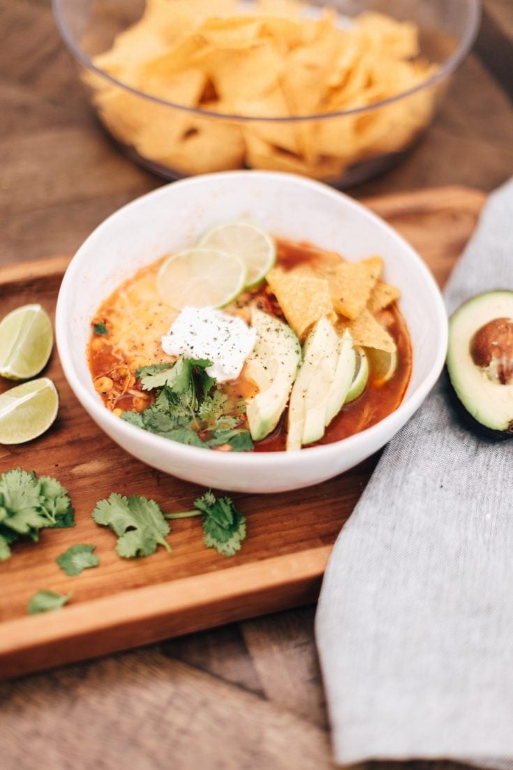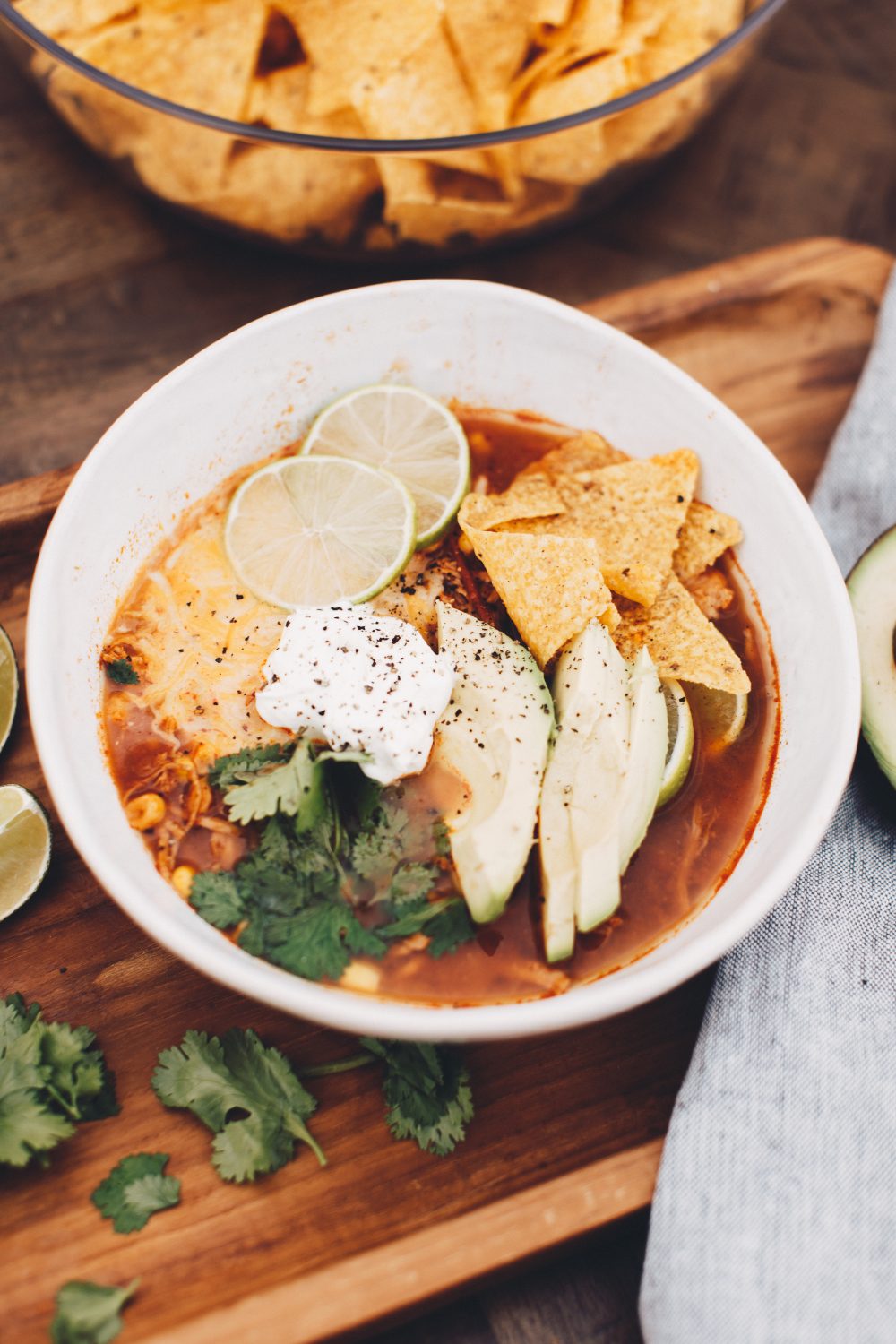 The broth of this soup is my favorite. It’s smooth and full of flavor! But once you top if off with toppings like diced tomatoes, cilantro, avocado, sour cream, and savory tortilla chips.
