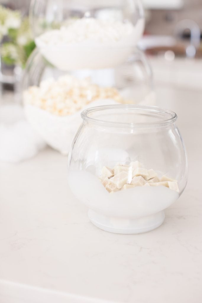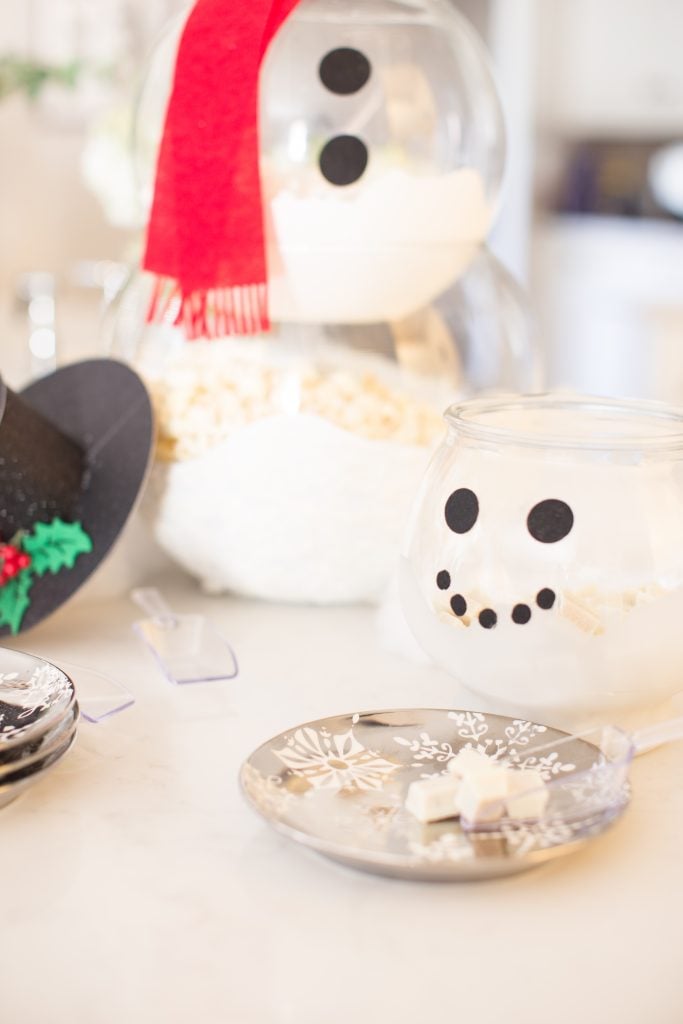 Once your glasses pieces have dried, start to assemble your snowman! I took a paper towel and made sure to give the glass pieces a little wipe down before I inserted the snacks.