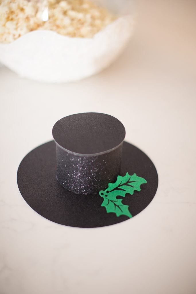 I uploaded a few different designs to my Cricut Design Space to help with the snow man parts and some I just simply made myself! For the hat I used a snowman SVG that I purchased and used the black glitter cardstock to cut it out and then I assembled it.