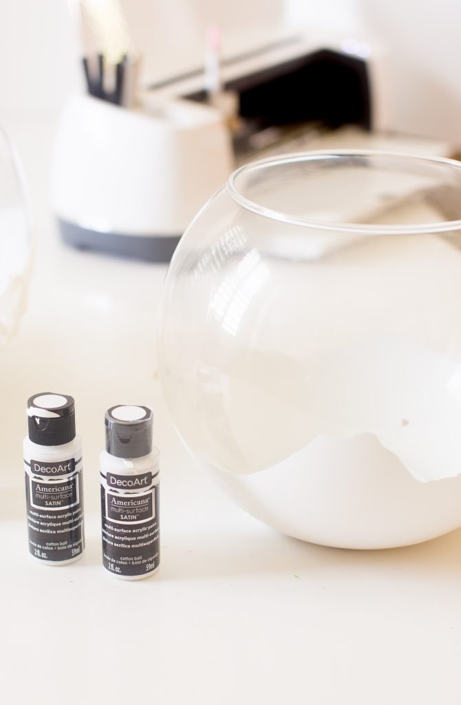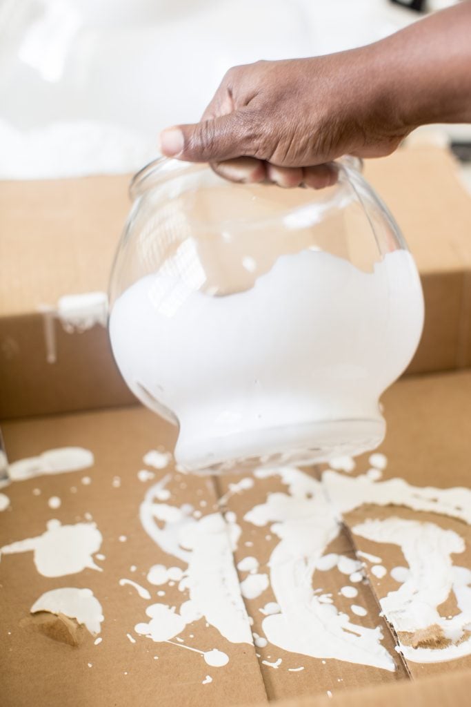 Next take your medium sized bowl and turn it upside down. Have a piece of cardboard or plate to catch the paint as it will fall and drip. Apply the Americana multi-surface paint in white, starting about halfway up in a hill like patten. Think snow hills. As the paint starts to fall apply more paint to the empty spots. Every now and then give it a bit of a shake to help distribute the paint evenly!