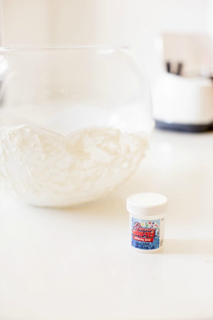 First, make sure all your glassware is clean. Paint goes on ALOT easier when you have a clean surface. Start off by applying a light coat of all purpose satin paint in white to the bottom of the largest glass bowl. Let that dry and then apply the snow tex material. Use your finger or a spatula or even a paint brush to give it some texture! I sort of made this up along the way so sorry I don’t have any progress shots. lol! But it’s pretty simple. Leave a comment if you have any questions about it though! The DecoArt Snow -Tex drys on hard and had a bit of glitter in it to give the surface some shine! Perfect for our snowman right?