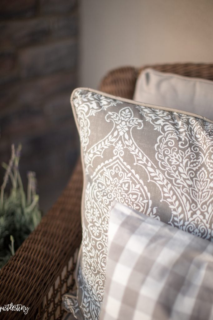 Gray damask back pillows add some wonderful texture and pattern. They also have the smaller pillows but I loved the option of using the bigger ones for the grass as well. We love to lay in the grass during the spring. Our winter rye is lush and perfect for laying out and doing cartwheels.
