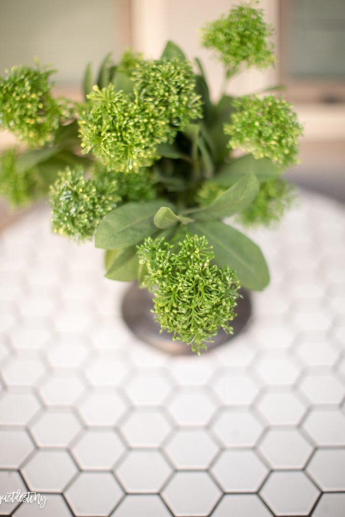 My favorite addition is this very affordable Farmhouse Mosaic table with a hexagon tile. Great for setting drinks or magazines on while we are outside!