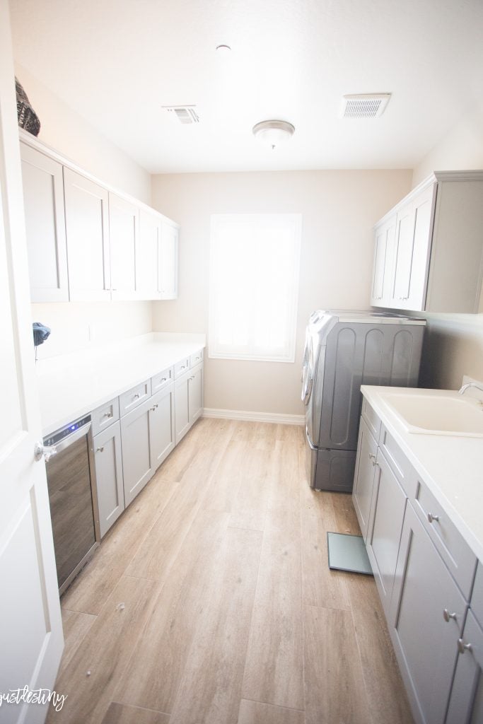 Again, we already had cabinets in our laundry room but it was still an upgrade with the builder. We didn’t have much room to play with the configuration but I thought it was better than an empty room. We have plenty of storage and plenty of space to fold laundry! If you don’t have any cabinets in your laundry I really think you should find a way to incorporate even a small set! It’s great for detergents, bulk items like toilet paper and paper towels, even stock items like toothpaste, soap and other often used items! Plus hidden storage is always nice to have when guests come over :0)